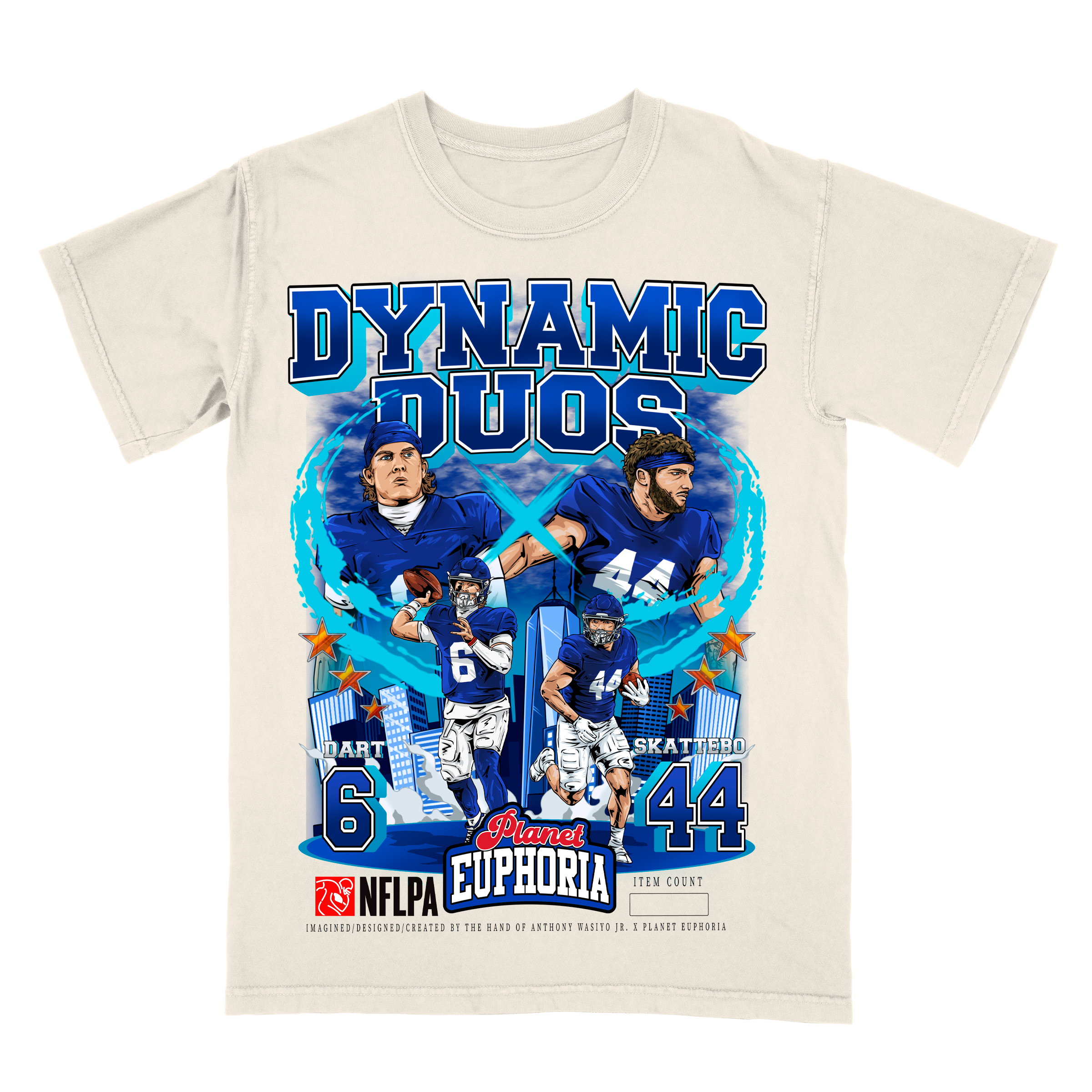 Limited Edition Jaxson Dart & Cam Skattebo 'Dynamic Duos' T-Shirt: Official NFLPA Licensed Merchandise, Collector's Edition, Hand Drawn Artwork, #/500 - Premium Quality, Hand Made Graphic Tee for New York Football Fans, Available in Off-White & Black