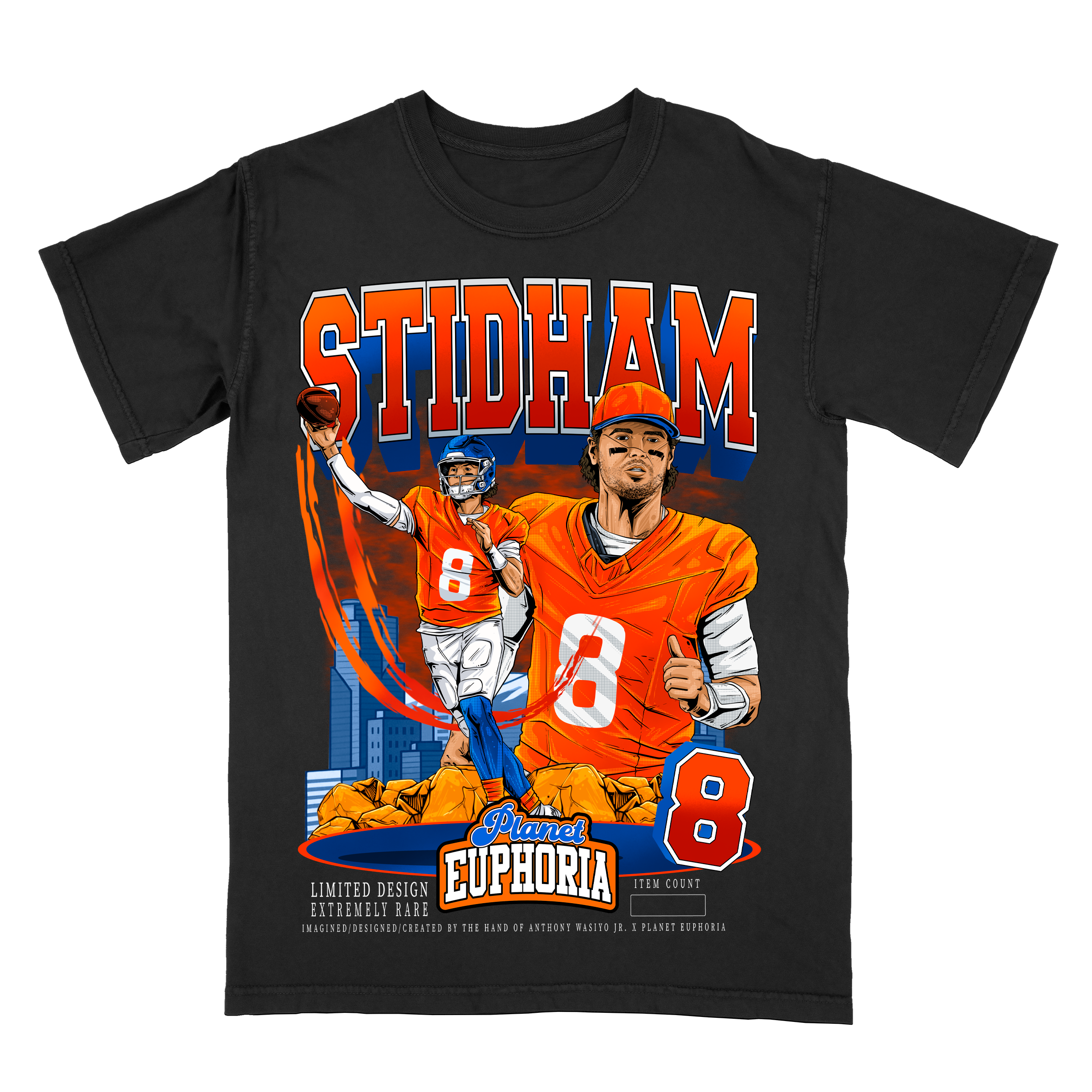 Limited Edition Jarrett Stidham T-Shirt: Collector's Edition, Hand Drawn Artwork, #/500 - Premium Quality, Hand Made Graphic Tee for Denver Football Fans, Available in Off-White & Black