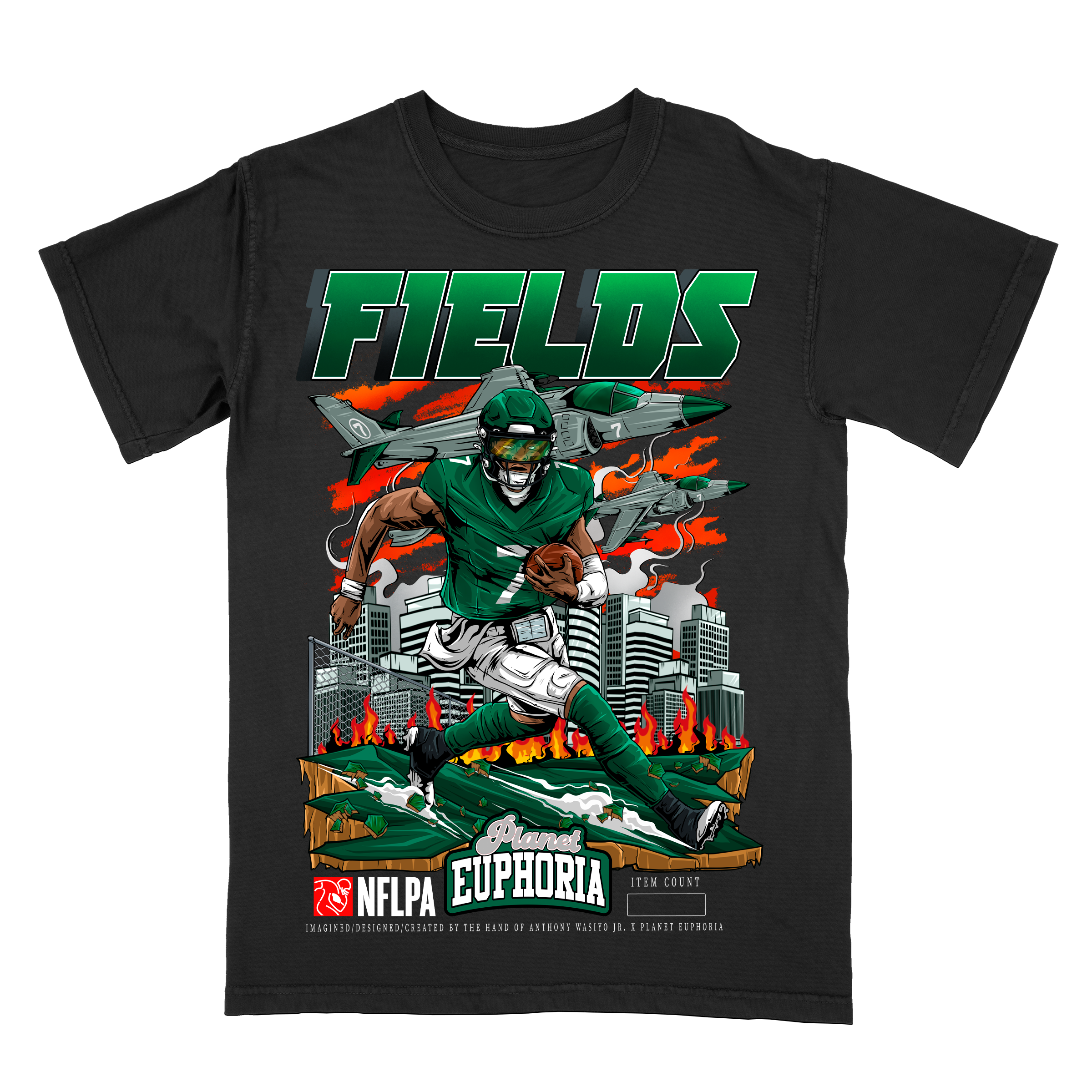Limited Edition Justin Fields V3 T-Shirt: Official NFLPA Licensed Merchandise, Collector's Edition, Hand Drawn Artwork, #/500 - Premium Quality, Hand Made Graphic Tee for New York Football Fans, Available in Off-White & Black