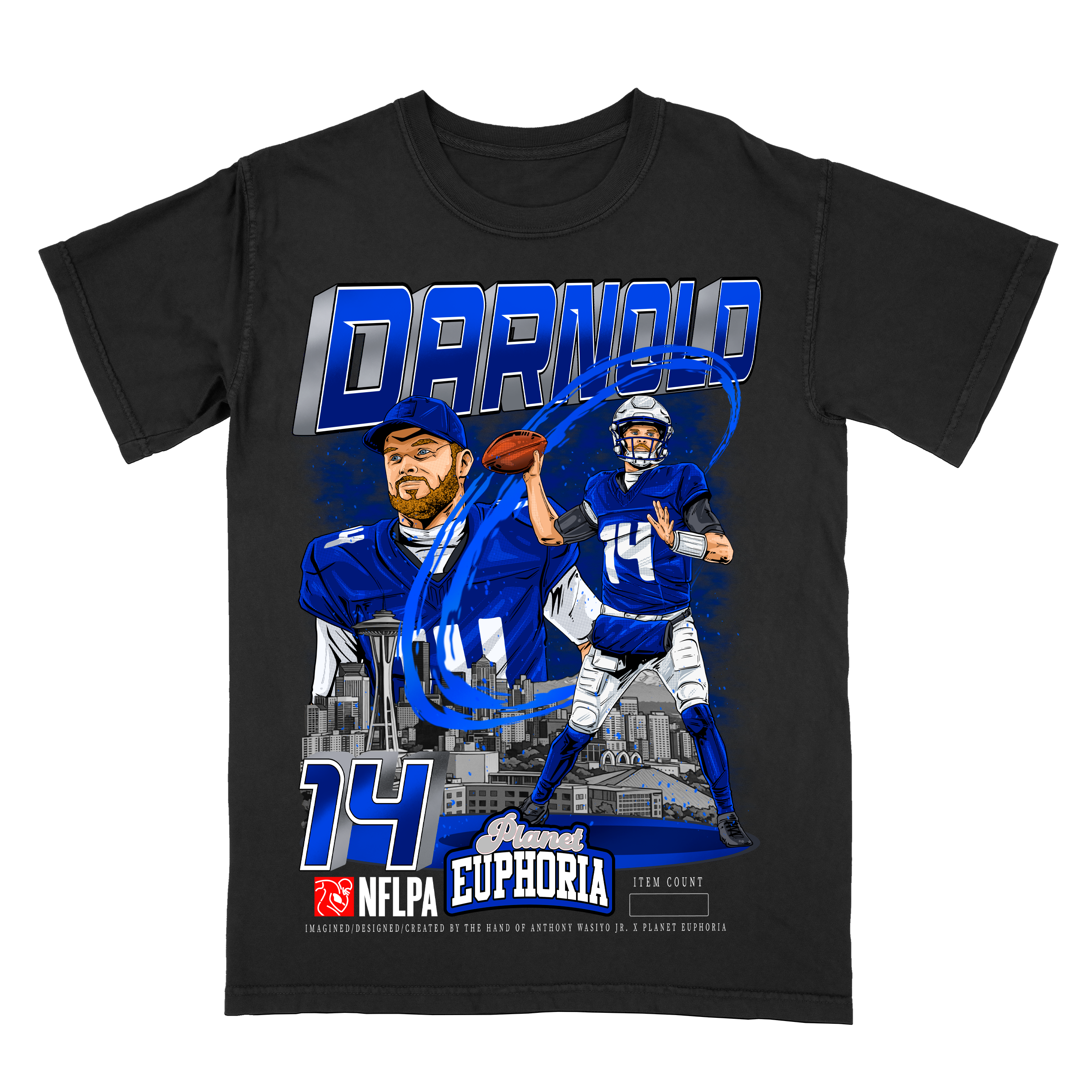Limited Edition Sam Darnold T-Shirt: Official NFLPA Licensed Merchandise, Collector's Edition, Hand Drawn Artwork, #/500 - Premium Quality, Hand Made Graphic Tee for Seattle Football Fans, Available in Off-White & Black