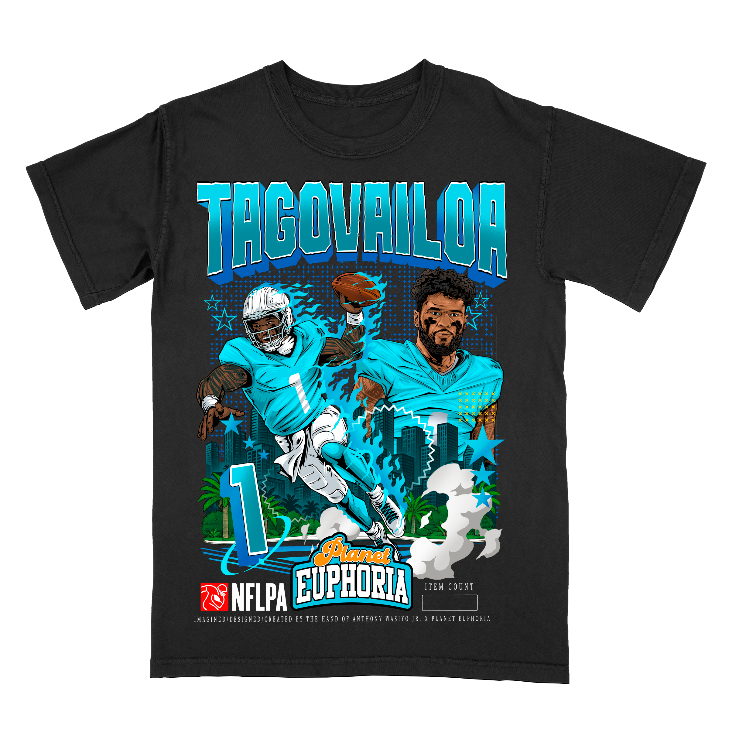 Limited Edition Tua Tagovailoa V2 Off-White T-Shirt: Official NFLPA Licensed Merchandise, Collector's Edition, Hand Drawn Artwork, #/500 - Premium Quality, Hand Made Graphic Tee for Miami Football Fans, Available in Off-White & Black