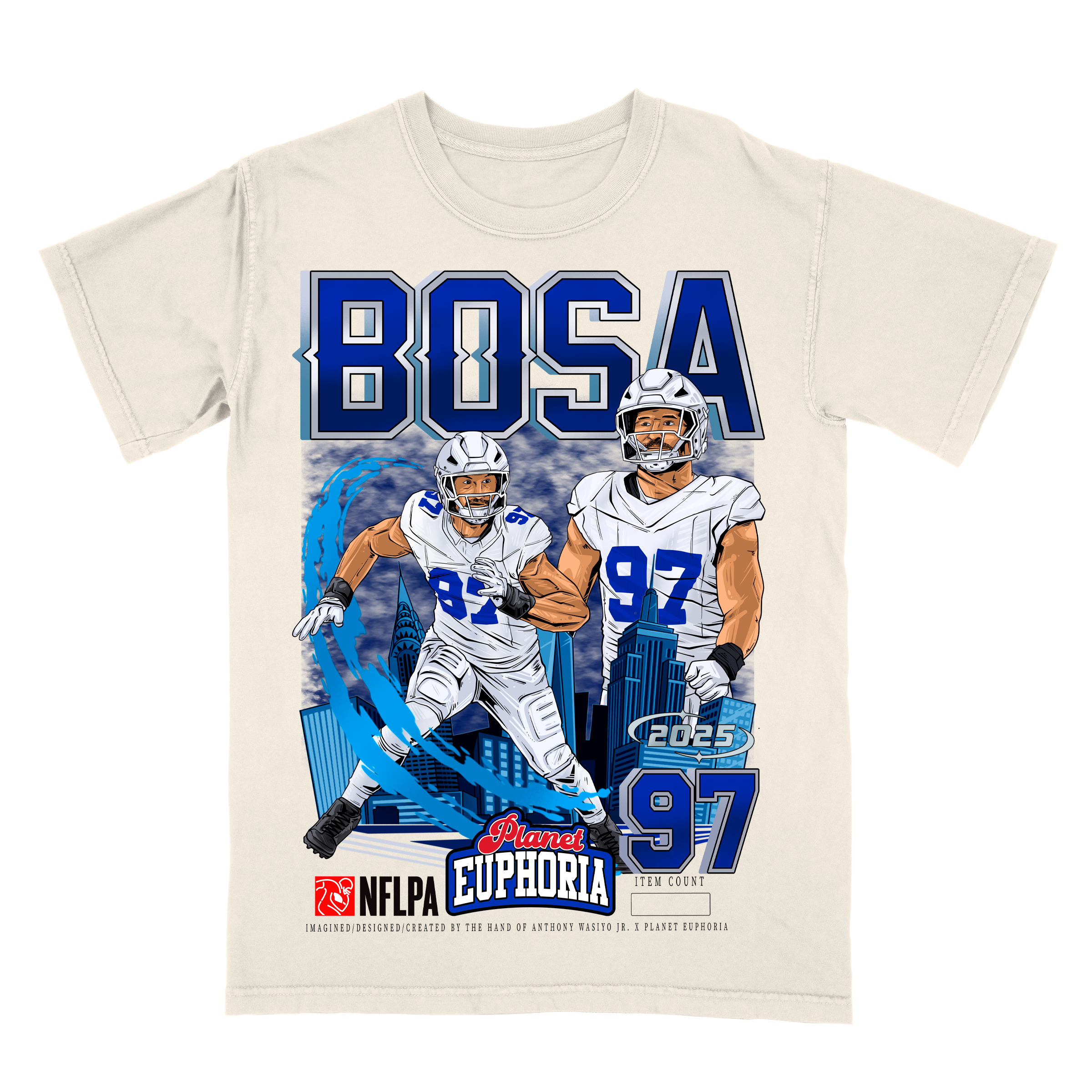 Youth Joey Bosa Off-White T-Shirt: Hand Drawn Artwork - Premium Quality, Hand Made, NFLPA Licensed Graphic Tee for Buffalo Football Fans