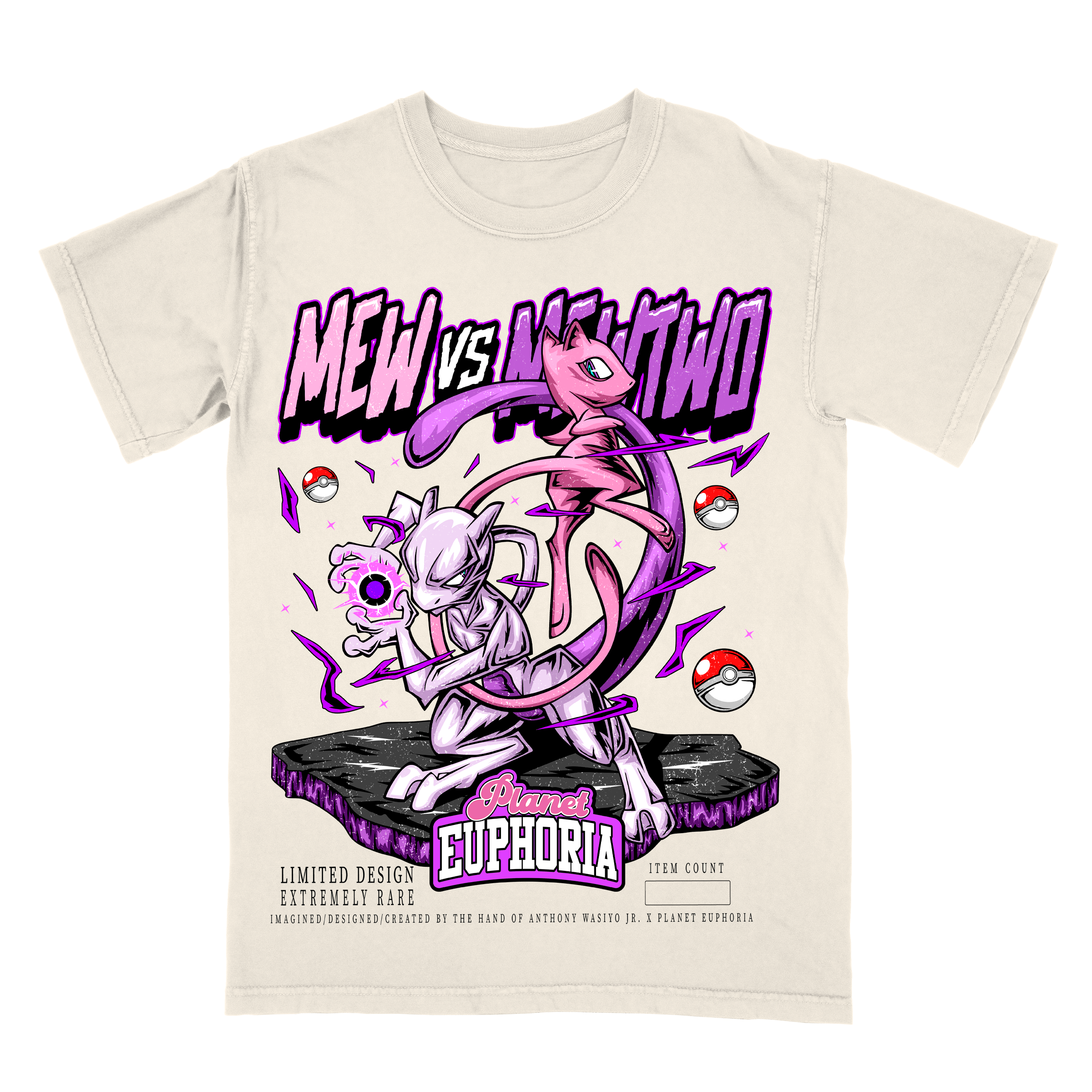 Youth Mew vs MewTwo Off-White T-Shirt: Hand Drawn Artwork - Premium Quality, Hand Made Graphic Tee